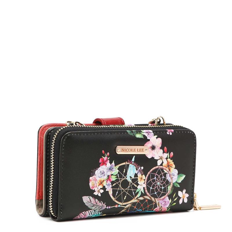Zip wallet opens up to interior ID window, 8 card slots, side zip and note pockets