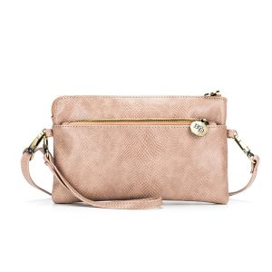 EXTERNAL FEATURES: Front zip pocket, long crossbody strap included, fits large smartphones