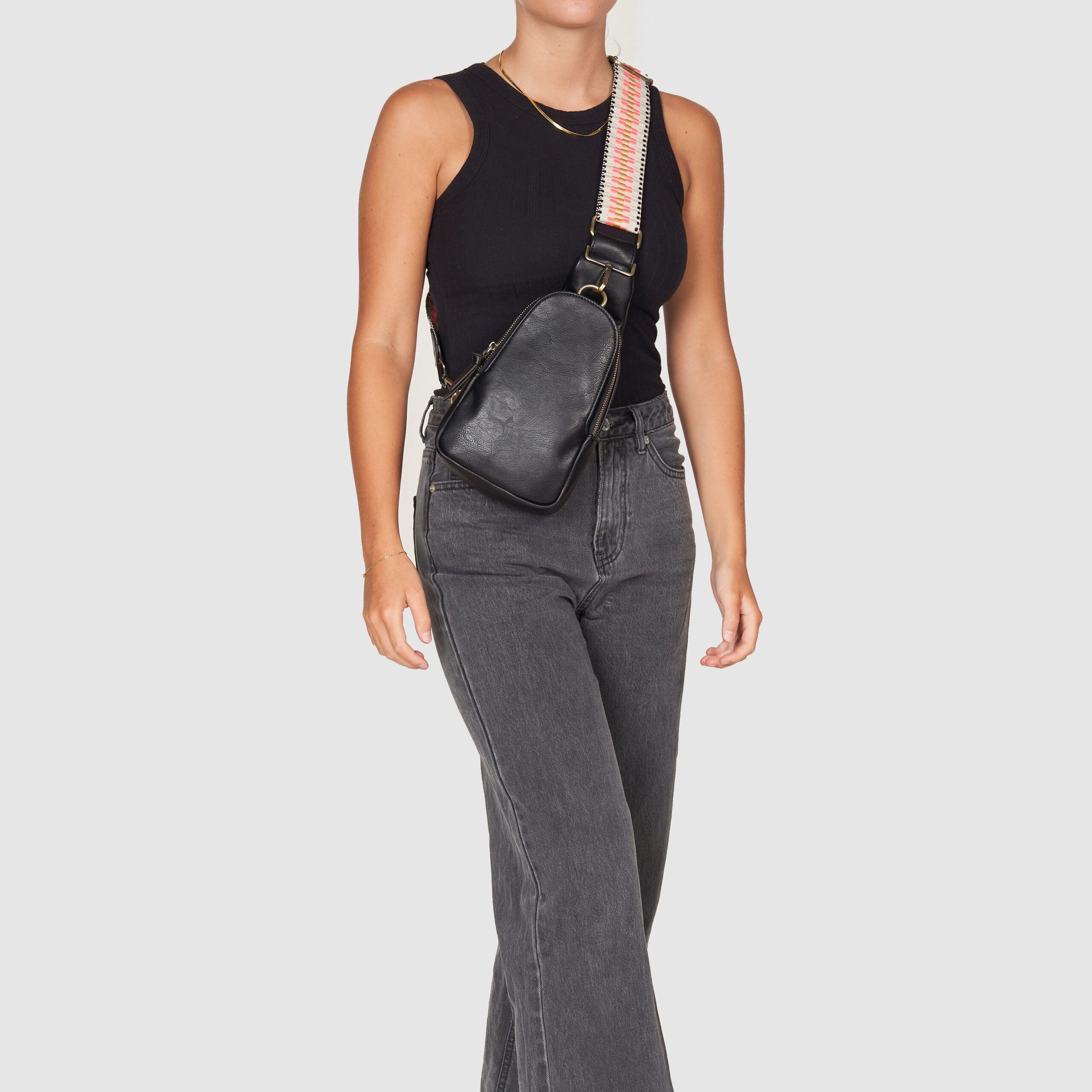 Compact sling bag designed from textured vegan leather. This funky little bag has a roomy interior that will fit your daily essentials and can be worn as either a front bag or back sling bag.