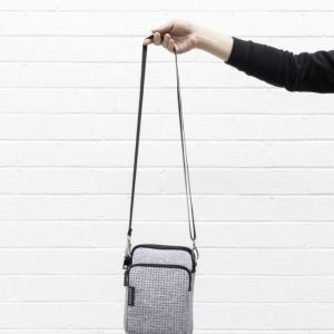 Bag is made up of 3 zip compartments. Features elastic tab on the back of bag which provides the option for bag to be worn with a belt around waist.