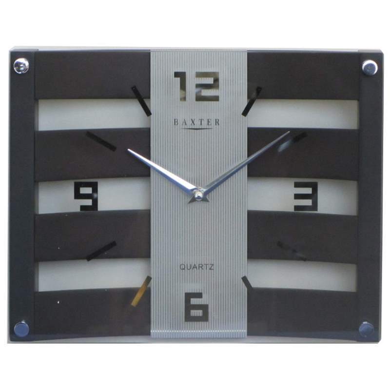 This wood and glass wall clock from Baxter has large numbers and markers that hekps you tell the time. Its square design lets it fit into any environment.